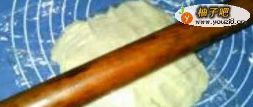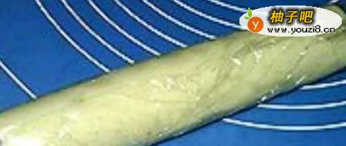 2接着以上的步骤,记得在案板上要铺上保鲜膜,用擀面杖把已经揉压好的白豆沙来回赶,用力要均匀,如下图所示。