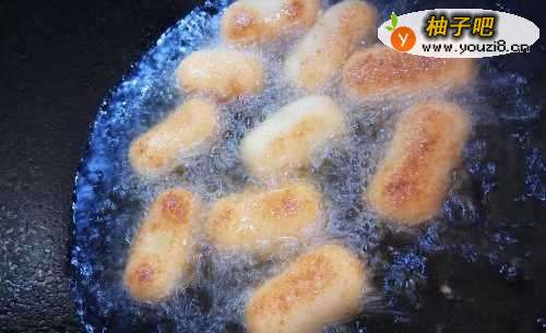 5继续炸制,此时可以用筷子不停地挨着拨动脆皮奶酪,直到整体炸成金黄色即可关火。