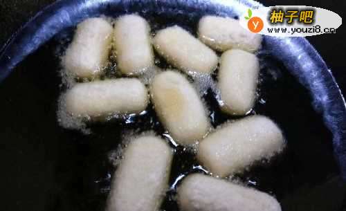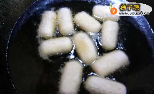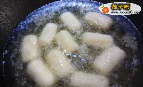 4然后,待脆皮奶酪膨胀大后,将火调制成小火,再用筷子将脆皮奶酪翻一翻。