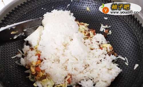 6最后倒入备好的米饭先翻炒2分钟,然后倒入酱油继续翻炒3分钟即可起锅。
