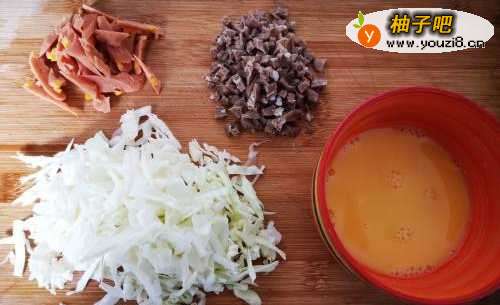 首先把包菜洗干净切细,牛肉丸切小块,火腿肠切条或者小块都可以,鸡蛋装碗打散备着,把米饭煮熟拿盘或者碗备着。