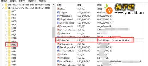 4依次点击 子目录 0000,观察右边的子项,寻找DriverDesc,判断后面的数值是否为WAN Miniport -Network Monitor,如下图所示,我找到的是0010,不知道不同电脑是不是一样。见下图