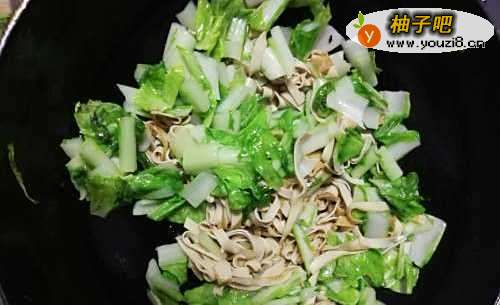 7青菜出水多,大火翻炒,千张可以吸收些汤汁的味道