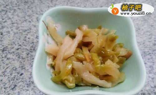 3准备好榨菜,我用的是现成的袋装榨菜,如果是榨菜球的话切成丝即可。