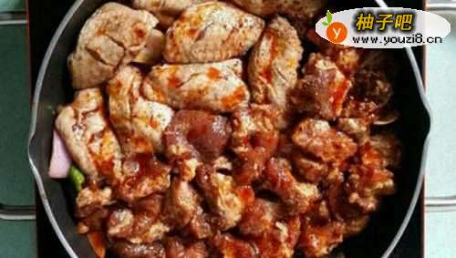 6开火后,把肉类平铺在配菜上面,喜欢吃肉的,肉使劲多放。