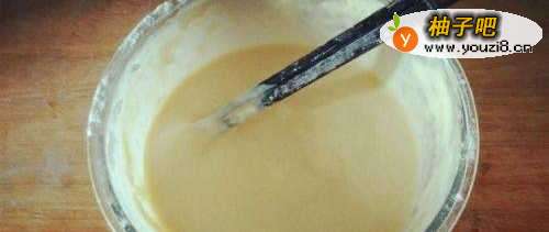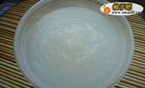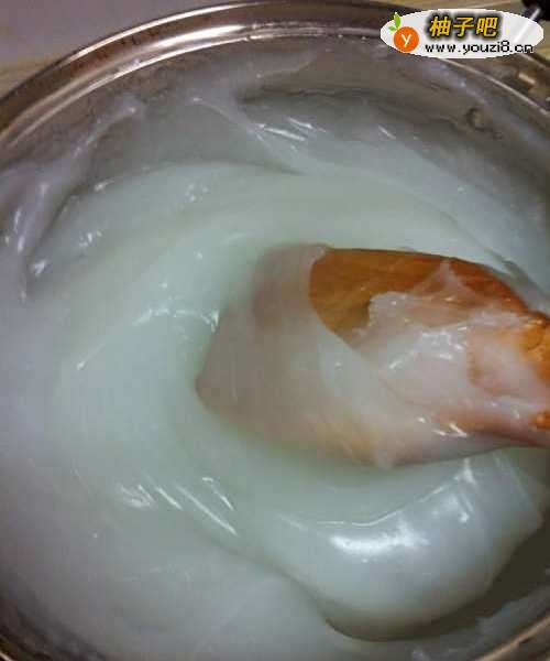 2剩余的水倒入锅中,开火,煮至水冒气泡,还没完全开的时候,边搅动边慢慢倒粉浆