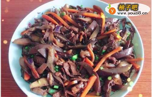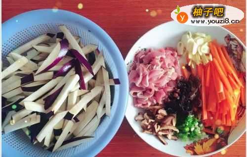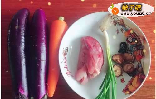 2处理食材:茄子洗净切条、胡萝卜和瘦肉切丝、香菇木耳泡发后切条备用、生姜葱蒜切好备用。一定要等到香菇木耳泡发好了再切,要不然炒了也不会变软,可以试着用热水泡发,可以节省不少时间。
