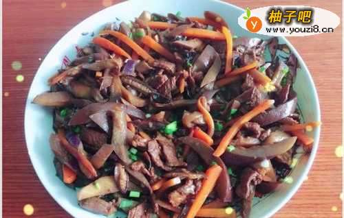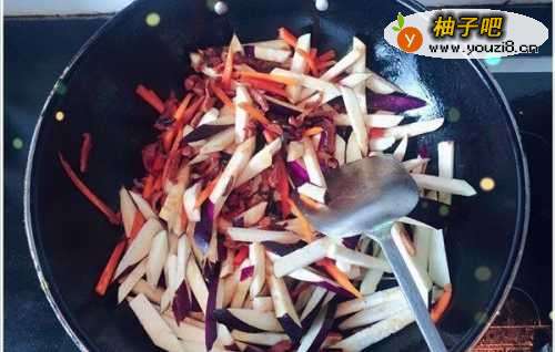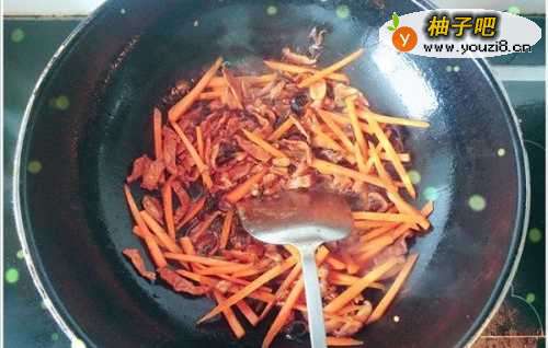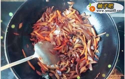 5然后放入事先准备好的胡萝卜丝、香菇和木耳丝,放入锅中翻炒均匀。香菇和木耳作为炒菜的配料,很多菜里面都会放,而且木耳是黑色食物,其营养对我们的身体也很有好处。