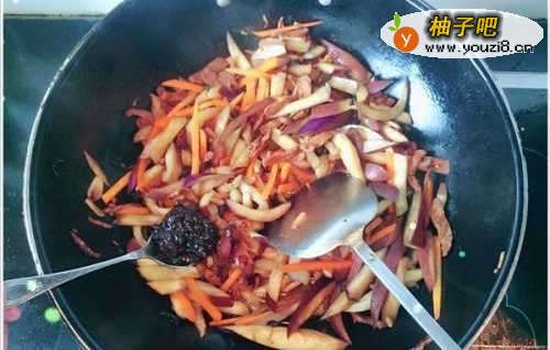 6然后放入茄子丝,加入适量的生抽翻炒均匀,如果觉得汤汁有点少的话还可以加入适量的白开水。因为汤汁少的话,茄子就没办法很好的上色了,所以适量的加点生抽和开水,也能帮助茄子上色和熟的更快。