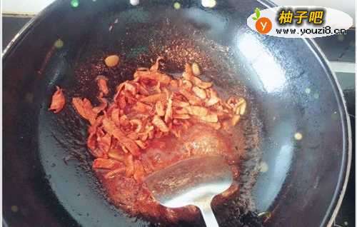 4姜蒜爆香后,放入瘦肉翻炒两分钟,然后加入适量的料酒、老抽给肉上色,翻炒均匀即可。炒肉的话我一般都会放一点料酒,有一种袋装的黄酒也是可以的。用老抽上一点色,肉的颜色更好看一点。