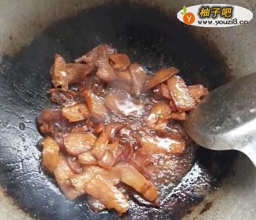 4如图,继续翻炒肉片,中火炒两分钟。