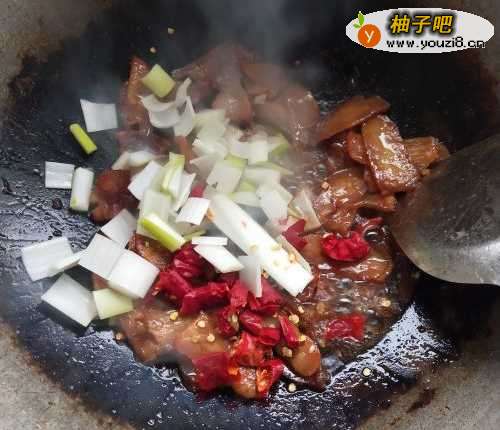 3如图,把切好的干红椒和大葱放进锅中,翻炒几下,接着放入适量腐乳。