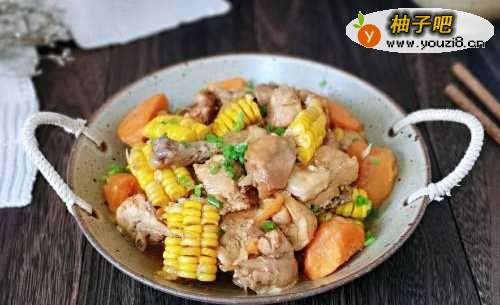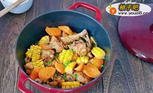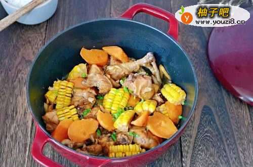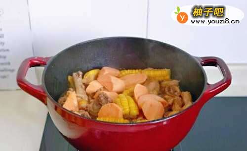 730分钟后,鸡块熟了,但是不够酥烂,这时加入切好的玉米,继续小火慢炖15分钟。