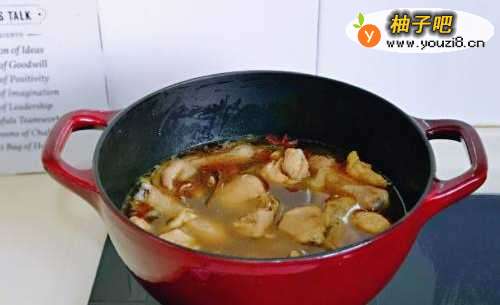 6最后加入开水,水量没过鸡块为佳。盖上盖子,大火烧开,转小火慢炖约30分钟,
