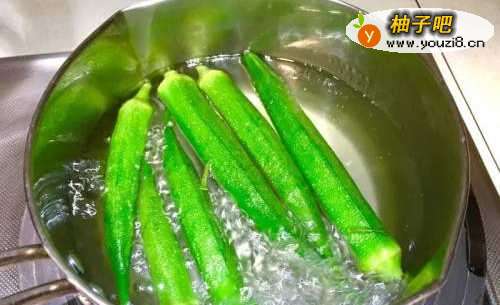 2秋葵抹上盐搓一搓表面,让秋葵上细毛脱落,然后在锅中水加入盐及些油氽烫2分钟,捞起入冰水中保持翠绿后切小段备用