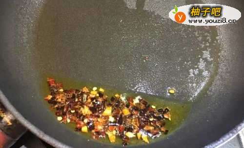 6另起锅放入香油先爆香花椒后捞起花椒丢弃,再放入干辣椒爆香