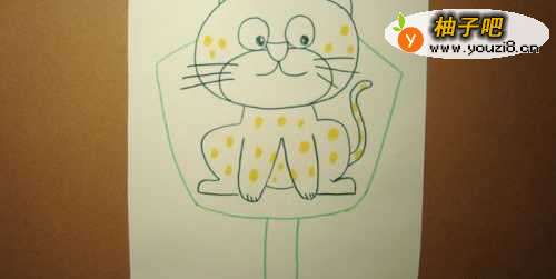 5接着,用橘色彩色笔画出可爱的小花豹身体上斑点,并用绿色彩色笔画出小花豹扇子的扇柄出来,如下图所示。