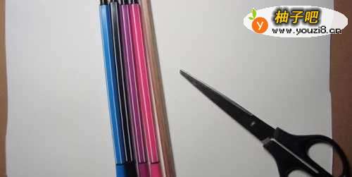 在制作可爱的小花豹扇子前,要准备好工具和材料,有白色的卡纸、铅笔、橡皮、水彩笔、剪刀,如下图所示。这可避免在制作时缺少工具,影响制作的时间和效果。