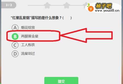 5你需要在第三题选B,原因是红色火星在紫色的浓烟中飞溅,火星、紫烟都是由炼铁而来