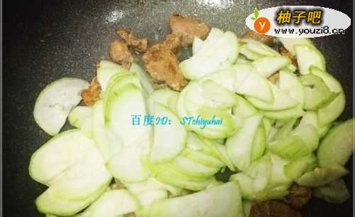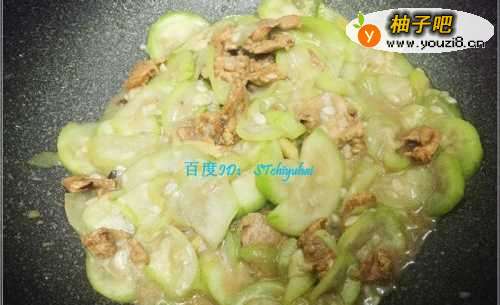 5一会加入前面准备好的辅料和丝瓜薄片,混合翻炒。