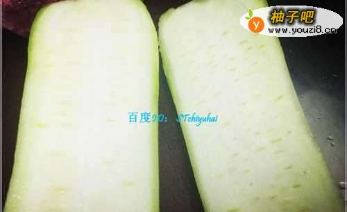 2将丝瓜去头去尾,然后腌制竖直方向对半切开,接着将其切成薄片状。