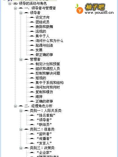 领导的活动与角色小节主要分为两大部分进行学习,其一是领导者与管理者,即介绍两者的概念和进行职能对比;其二是经理角色分析,这部份的学习主要是明白经理的三个角色类别。图形表示如下:
