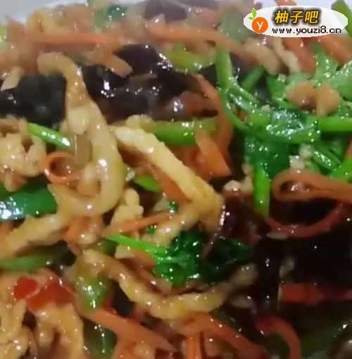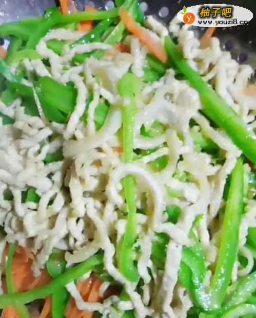 6最后加肉丝、胡萝卜、青椒、木耳,香菜,搅拌均匀即可。