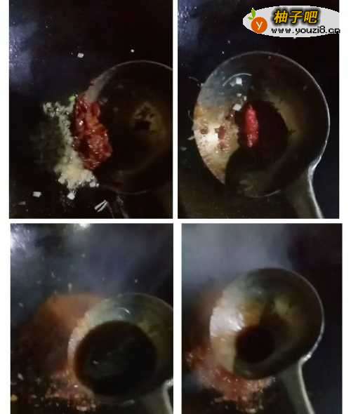 4锅中加入豆瓣酱、番茄酱、酸醋、酱油炒匀。