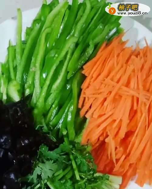 准备好新鲜的肉丝,一点木耳,香菜,青辣椒和胡萝卜,洗净,切丝。