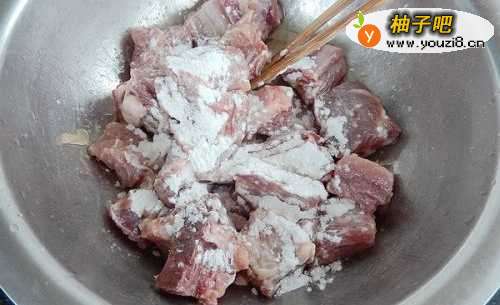 4排骨沥去一些水分,加2勺油拌一下,再加入适量玉米淀粉拌匀。赞拌点油,油可以锁住排骨水份。这样也防止入油锅时会炸油,排骨炸后外酥里嫩。