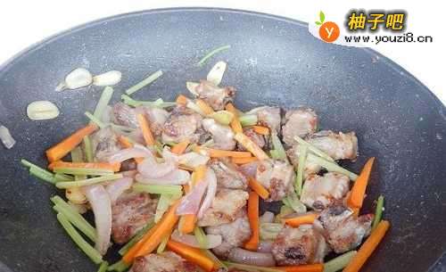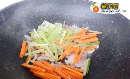 7加入胡萝卜、芹菜炒至变软。