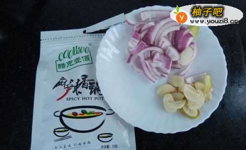 3切好洋葱丝,姜片,备好干锅调料粉。喜欢辣的可以多放一些干锅调料粉。