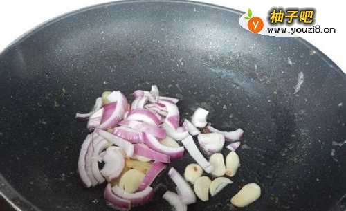 6锅中留底油,入生姜片,洋葱丝,蒜片炒香。如果用郫县豆瓣酱,干椒、香料这些食材,在这一步加入即可。