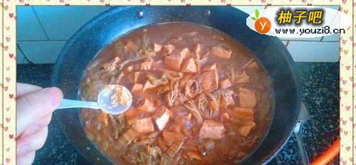 3即将出锅前,先向锅内加入适量鸡精,用铁铲翻动均匀,继续炖制2-3分钟便可盛入碗中。
