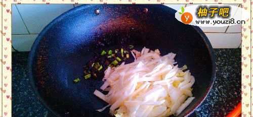 3将燃气调至中火,向锅内放进切好的白菜帮,翻炒至全部菜帮均匀上色。