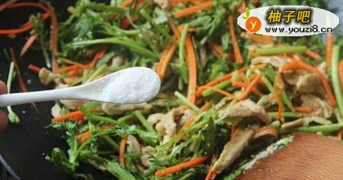8待茼蒿炒软时加盐或胡椒粉调味,翻炒均匀即可关火;