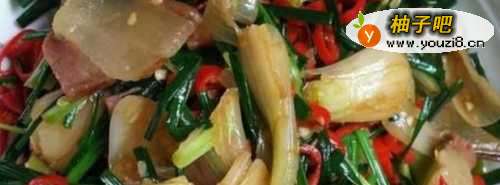 4第四步,煸炒出油脂后,放入藠头和红椒