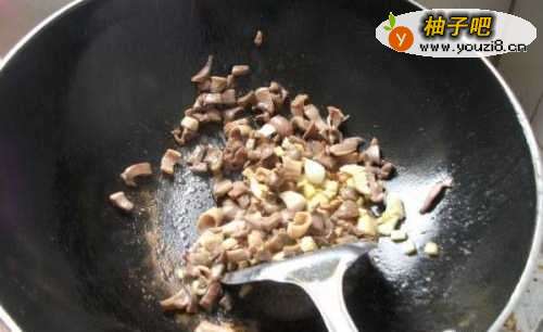4倒入蒜头生姜料煸香,用生抽稍上色。