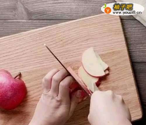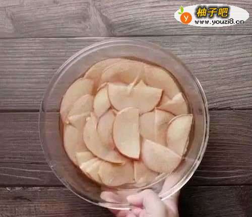 2把切好的苹果片倒入热水挤入柠檬汁。放入微波炉烤软化。见下图