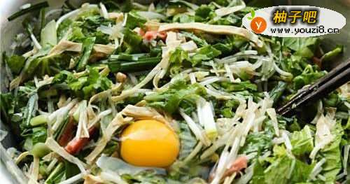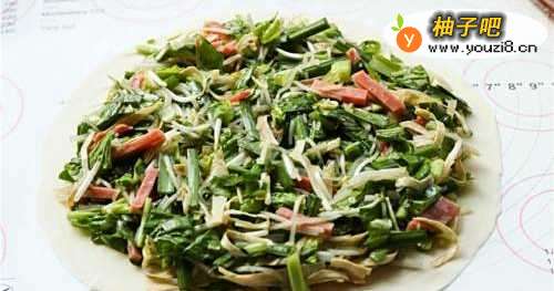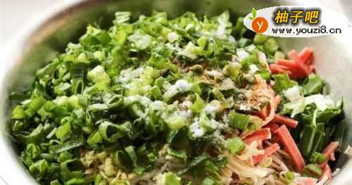 3蔬菜处理一下,不需要切的太碎,切段即可。粉条用开水烫一下,切碎,豆腐皮泡软切碎,午餐肉切成丝。香菜和葱姜都切末待用。全部切好的食材放在料理盆里,加入调料拌匀。