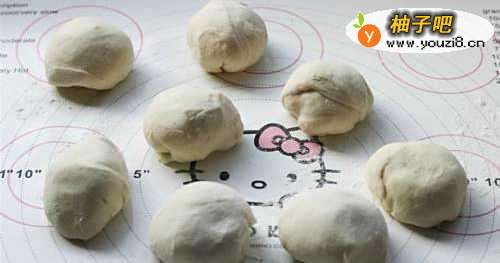 5醒发之后的面团分成均匀的8份,再次揉圆待用。两个一组,总共可以做4个菜馍。