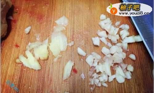 3开始准备凉拌时所需要的调味料,取少量生姜、蒜头,生姜去皮洗净切成细丝,蒜头拍碎去皮切成蒜末,还有准备一味很重要的调味品--香油。