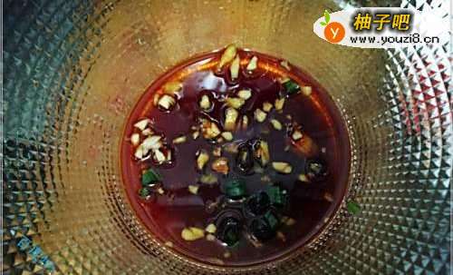 4取一开口碗,加入少许盐巴、酱油、料酒、醋以及前面准备好的细姜丝、蒜末、香油,用筷子搅拌均匀,放在边上备着。