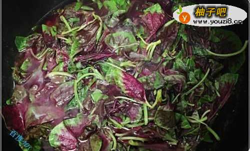 5往烧开的水中加入前面洗净的苋菜叶,用筷子翻动,让其均匀没入水中,大约2分钟左右,将苋菜捞出,放入前面准备好的开口碗中,用筷子均匀搅拌,让苋菜均匀沾染酱汁。