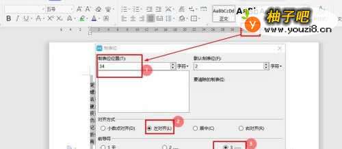 4在制表位窗口,设置表位的【位置】、【对齐方式】、【前导符,虚线格式】等条件,然后点击【确定】;