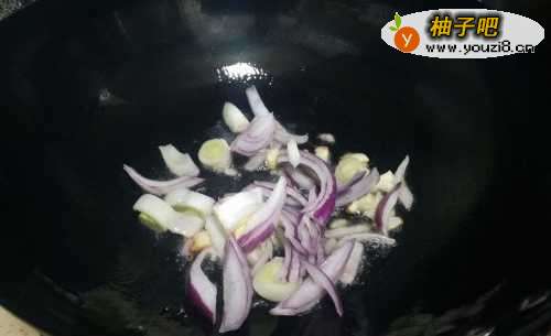 3起锅烧油,先放洋葱和葱花爆香,加一点食醋。