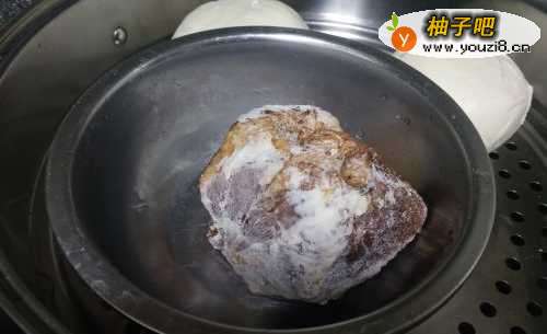 2腌肉从冰箱拿出来,放到蒸屉上蒸一下解冻。