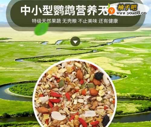 2无壳谷物粮:无壳粮是各种瓜果蔬菜坚果去壳后的原始状态,可以让鹦鹉吃到最原始的食物,并且增加他们的进食体验,相对于滋养丸没那么容易消化