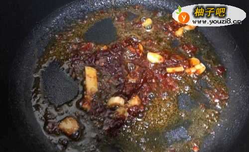 5锅里留适量底油,把葱蒜拍碎后放进去,再加入郫县豆瓣酱炒香