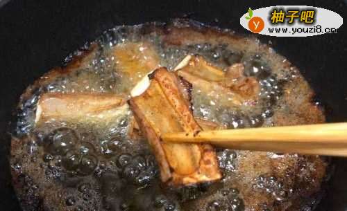 4锅里倒适量油,油热后把排骨放进去炸至金黄后捞出控油